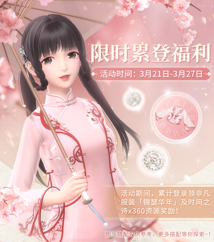★活动时间:3月21日更新后-3月27日23:59 ★活动方式:活动期间,累计登录游戏达指定天数,即可获赠精美单品【非凡·锦瑟华年】等奖励。
