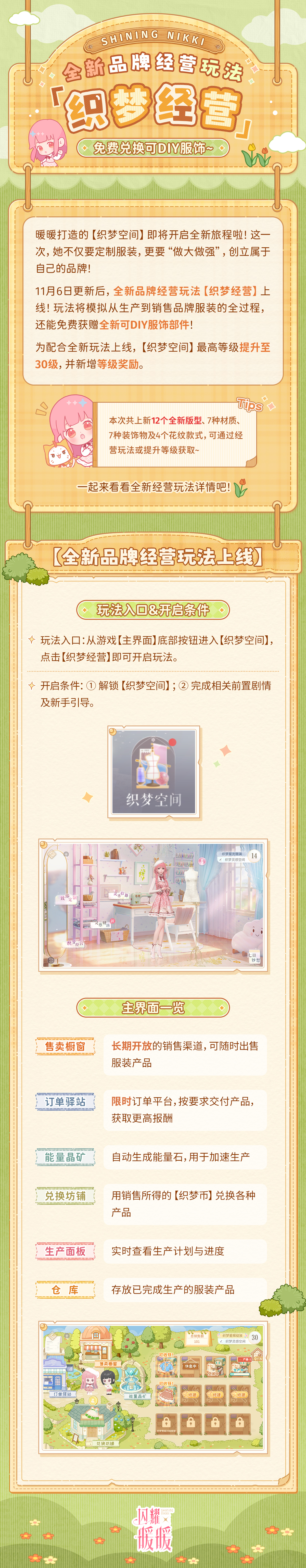 ⭐11月6日更新后,全新品牌经营玩法【织梦经营】玩法&全新可DIY制衣素材上线,和暖暖一起打造服装品牌,体验从生产到售出的完整乐趣吧~