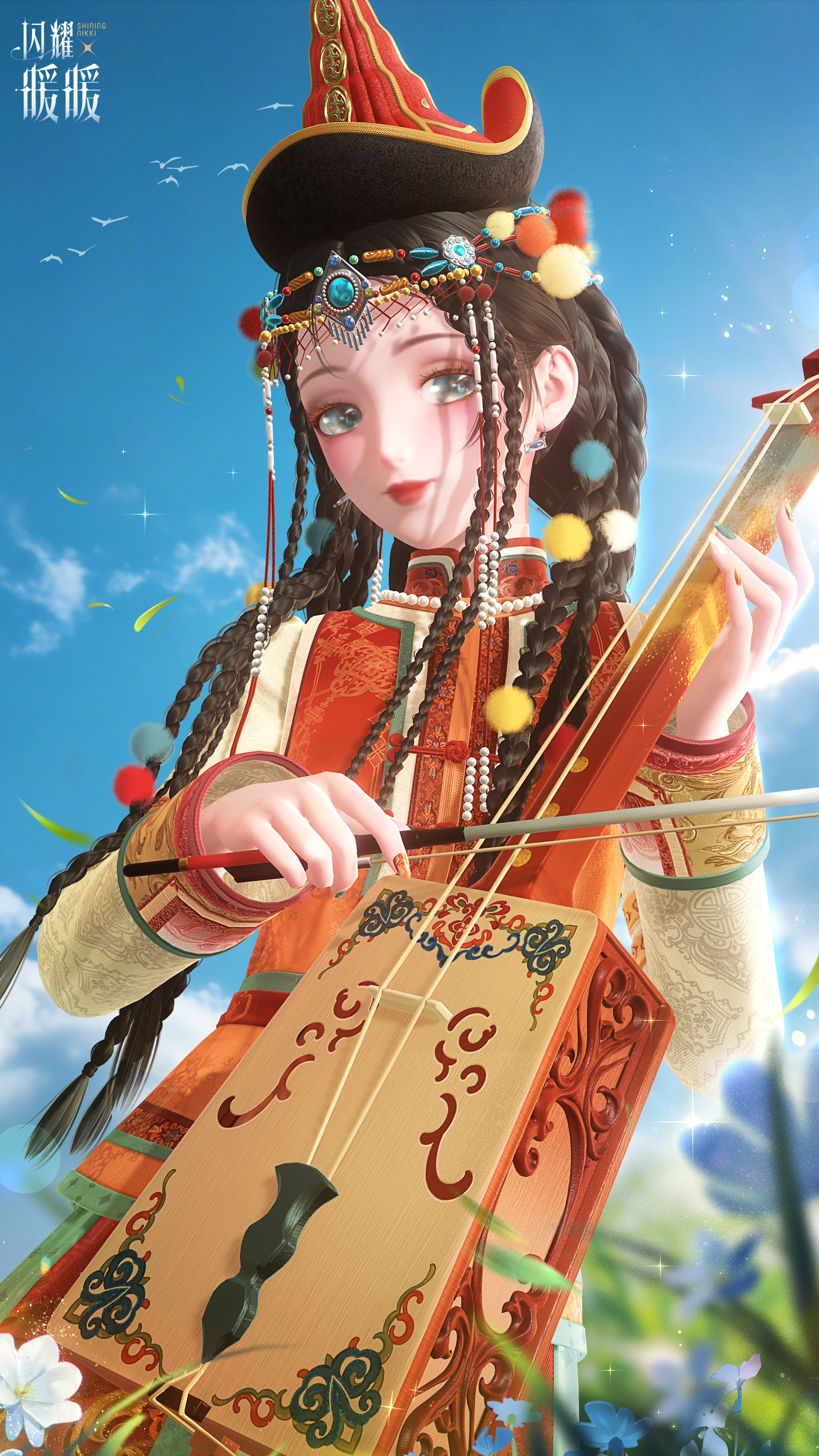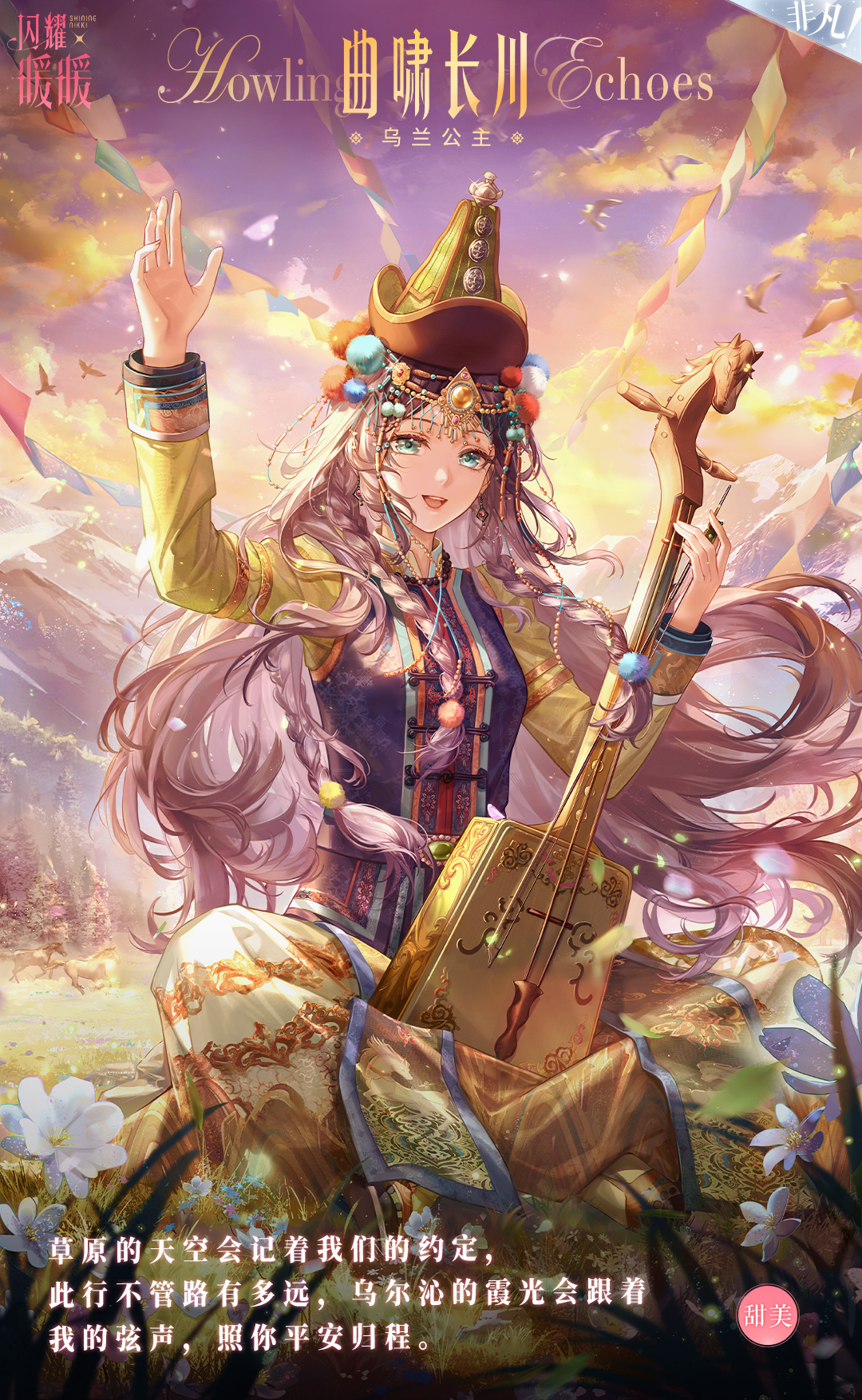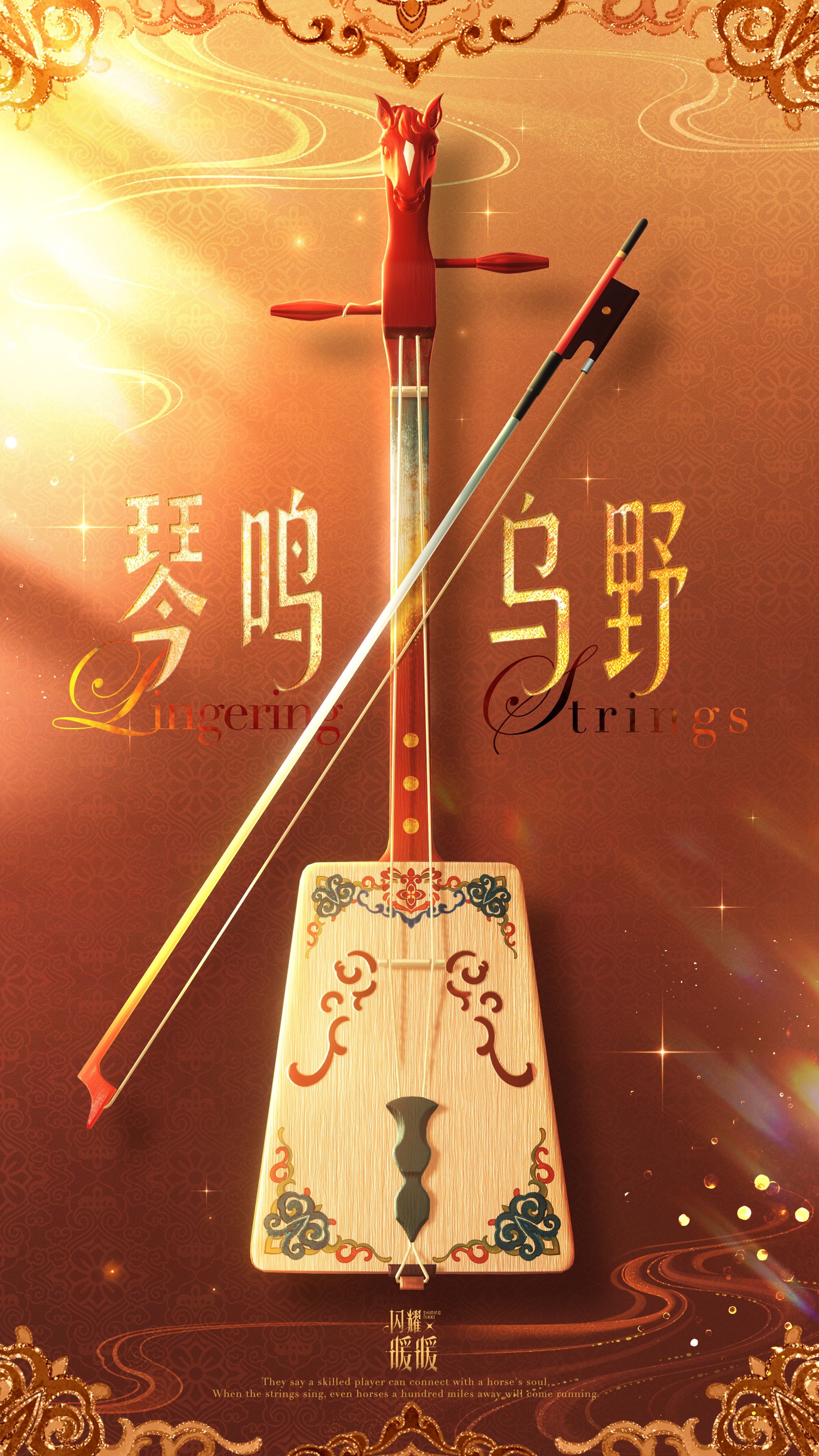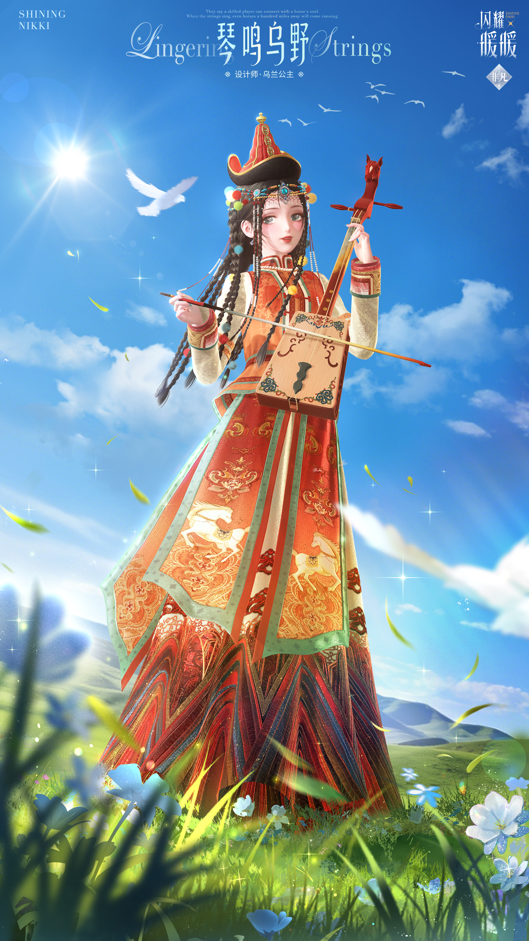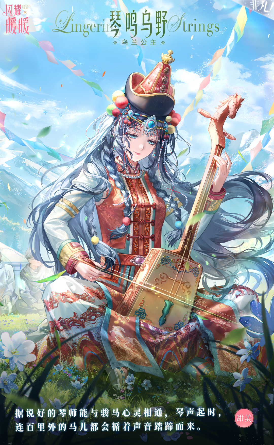衣袂间遍染霞光的绮色,裙裾上绣有灵动的骏影,她手执一把精致的马头琴,缓缓奏响悠然的乐韵。