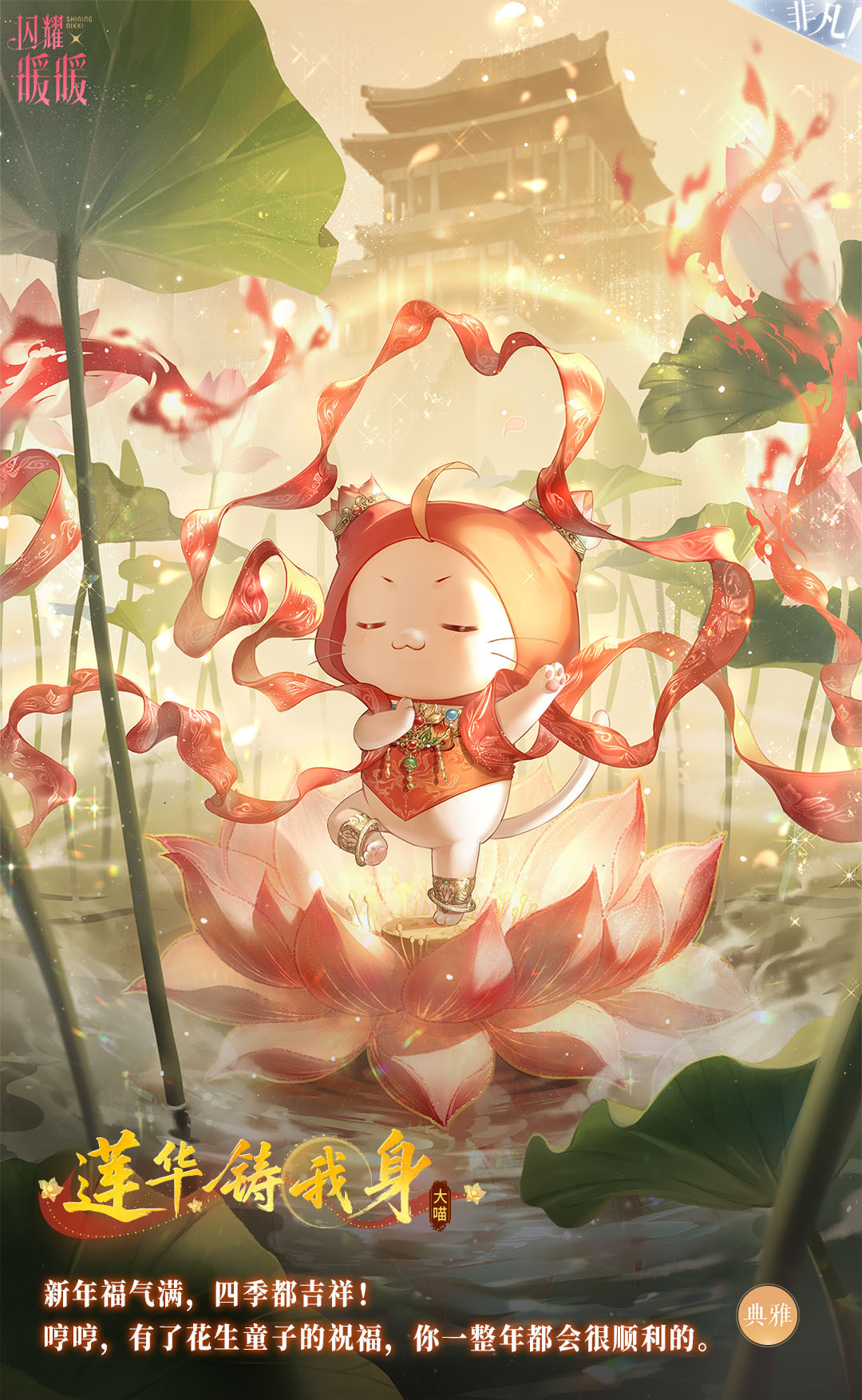 活动期间,通过活动中心-限时累充福利,累计充值达指定尊享经验,即领非凡套装【莲华铸我身】、系统主题【岁华织锦】、好友名片【锦岁祥春】及海量材料奖励!