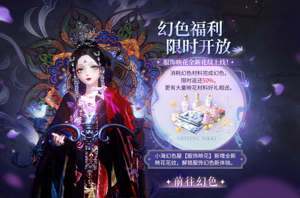 活动期间,点击【活动中心】-【幻色限时返还】,消耗幻色材料完成幻色,限时返还50%幻色材料,更有【闪耀】焕彩之丝、【闪耀】绘色之丝等大量映花材料好礼相送。