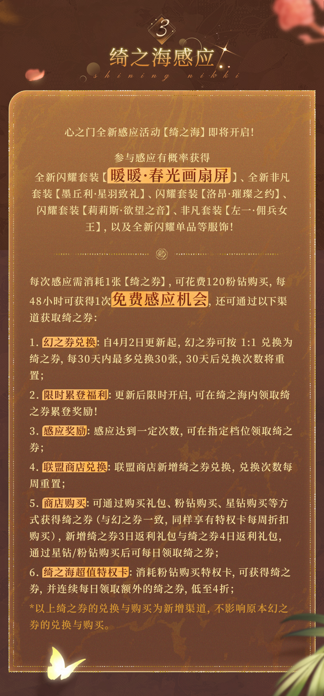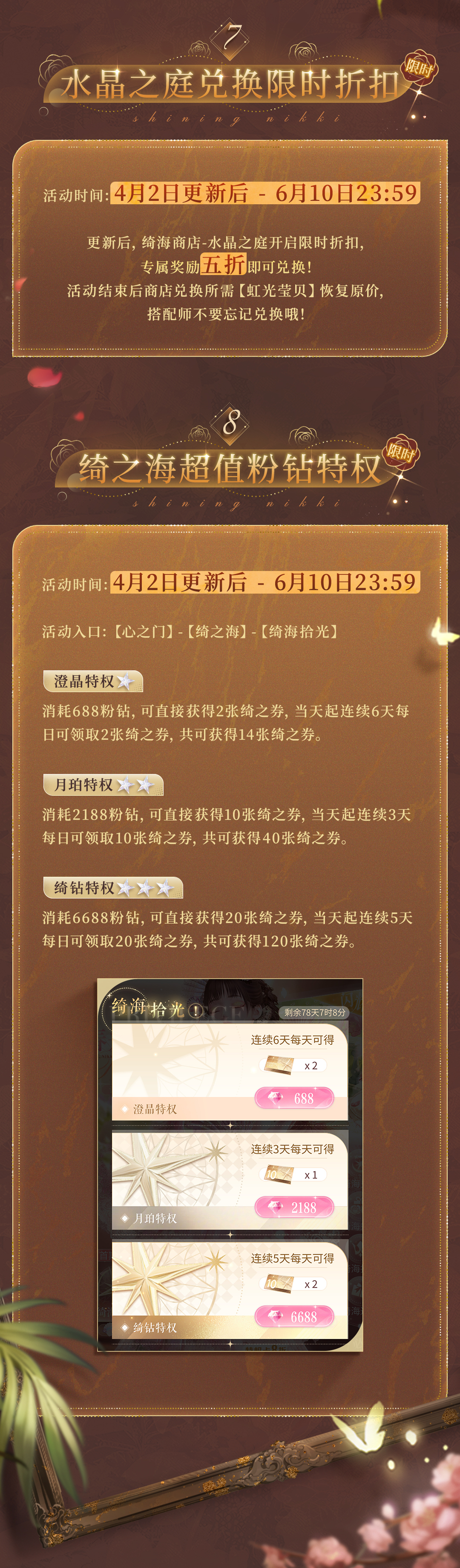 还有超值粉钻特权、限时折扣兑换等,更多关于「绮之海」感应活动的规则及限时活动介绍请查看图片说明!